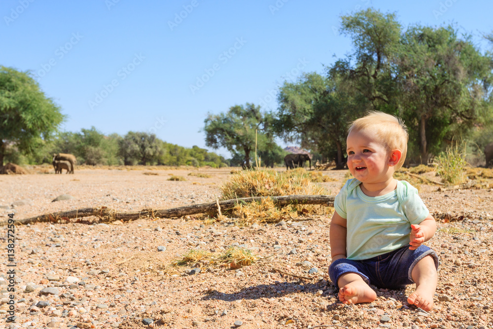 Baby sitzt im Sand des Aba Huab Trockenflussbett, hinten Elefanten (Loxodonta africana)