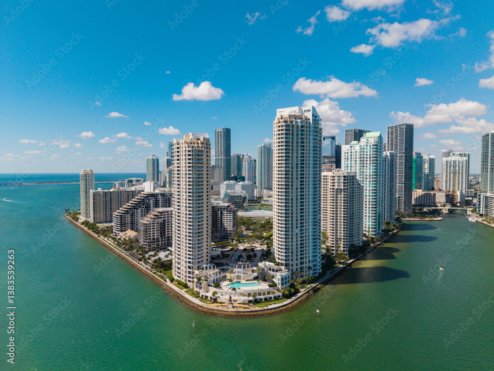 Miami city skyline view of Brickell key. Miami downtown. Skyscraper building. Cityscape building downtown. City architecture. Miami downtown skyline. Miami skyscraper cityscape