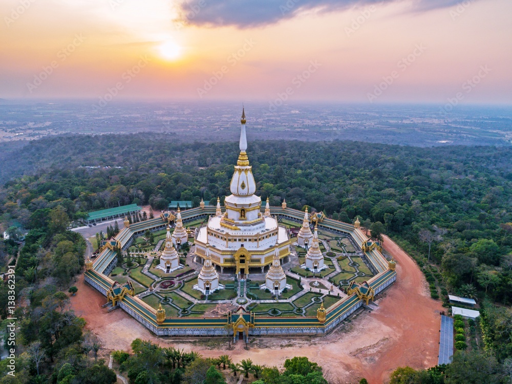 Aerial view landmark : " Pra Maha Chedi Chai Mongkhol Temple " at sunset sky. beautiful public landmark of Roi-Et Province, Thailand.