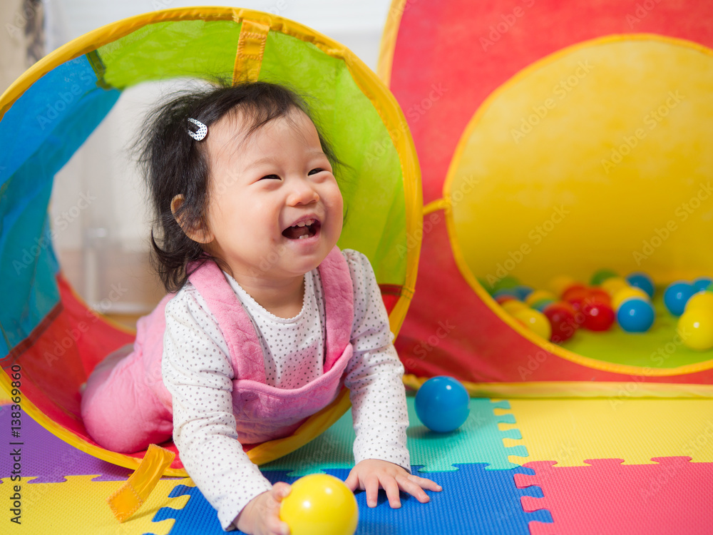 cute smiling baby girl play toy at home