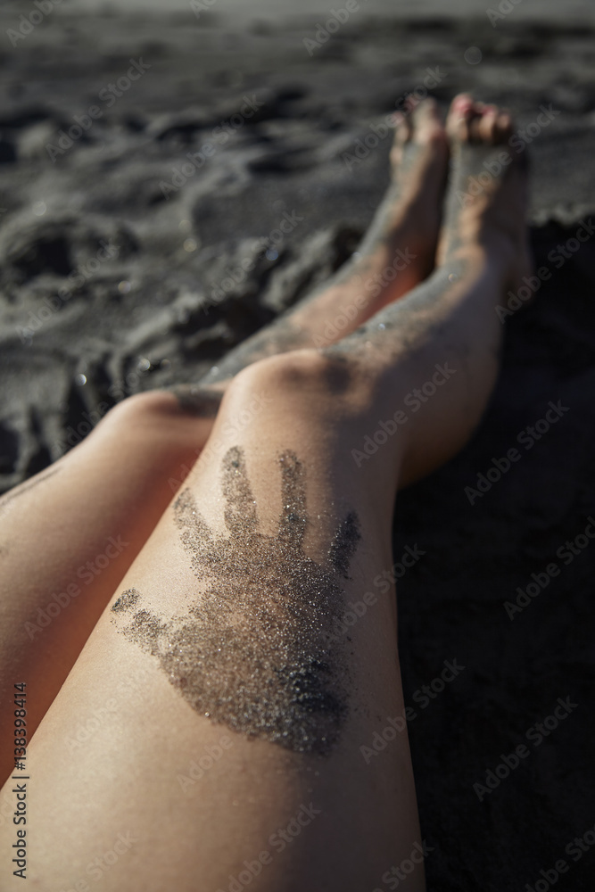 Sandabdruck von einer Hand auf einem Bein am Strand