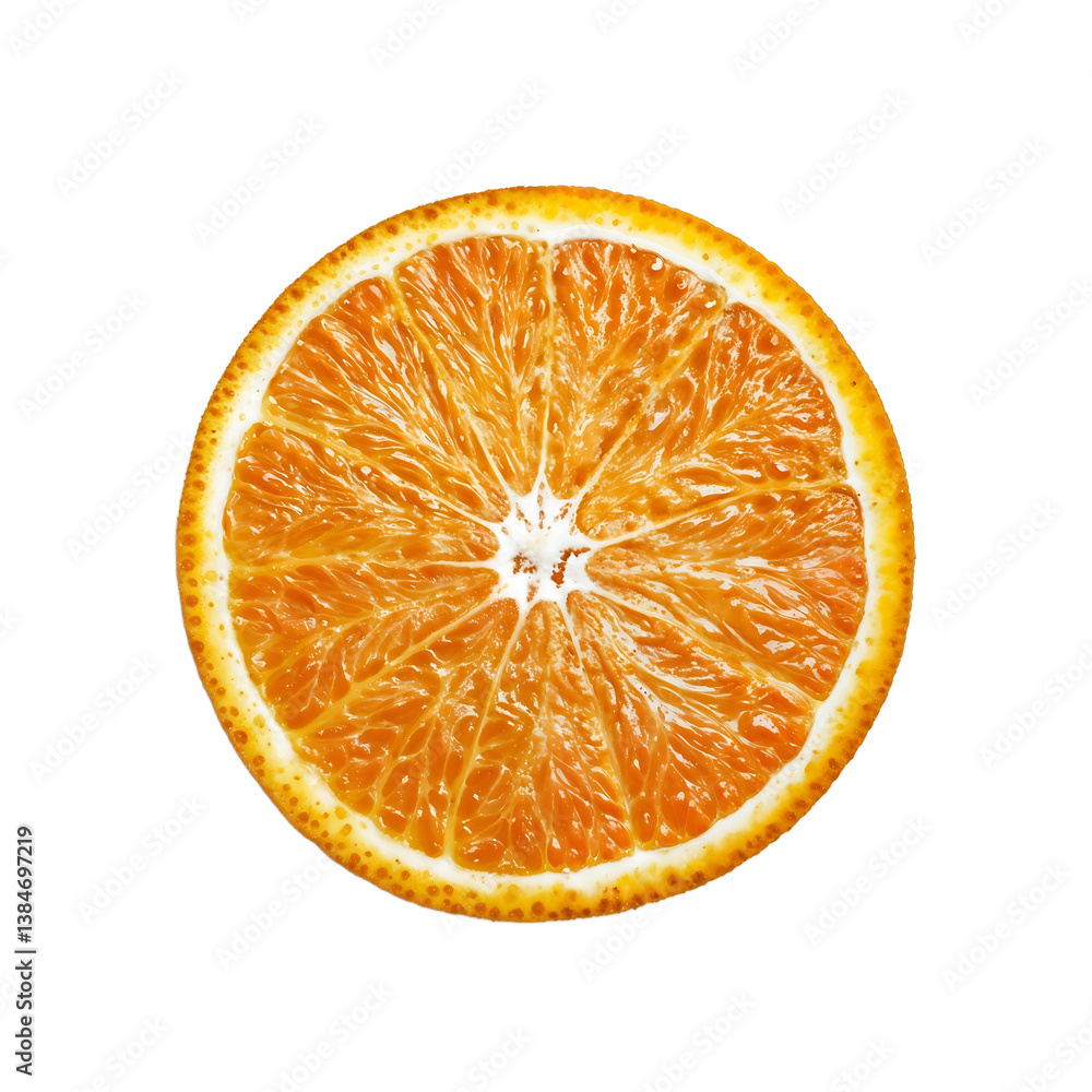 Close-up of a perfect cross-section of bright orange fruit showing detailed pulp segments and central pith on a transparent background, exhibiting vibrant citrus texture