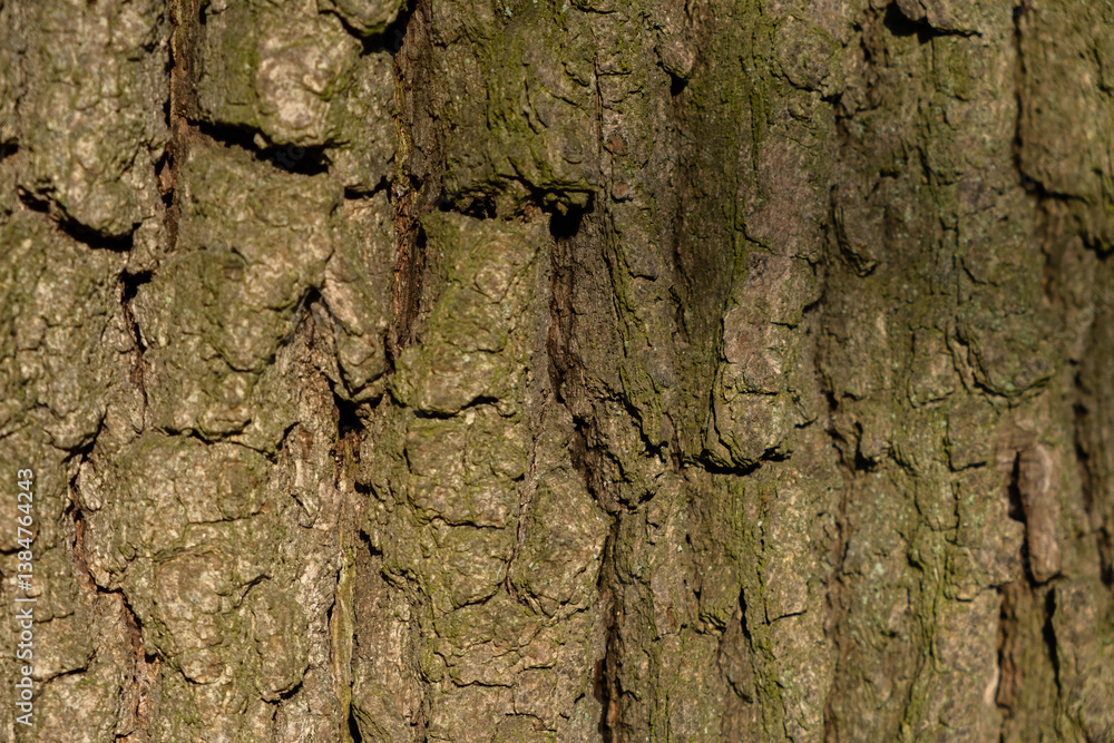Oak bark texture. Macrophotography of tree bark. Abstract background for design, presentations and creativity. Brown and green are natural shades. Full frame. Bright sunlight on the veins, moss inside