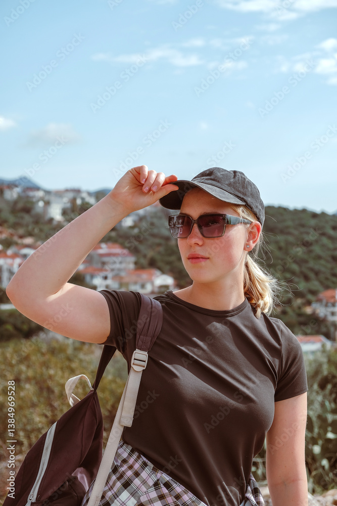 Travel,Young female traveler walking alone alongscenic mountain road solo travel, digital nomad lifestyle, eco-friendly road trip adventure.moment of mindful journeyexploration in nature.
