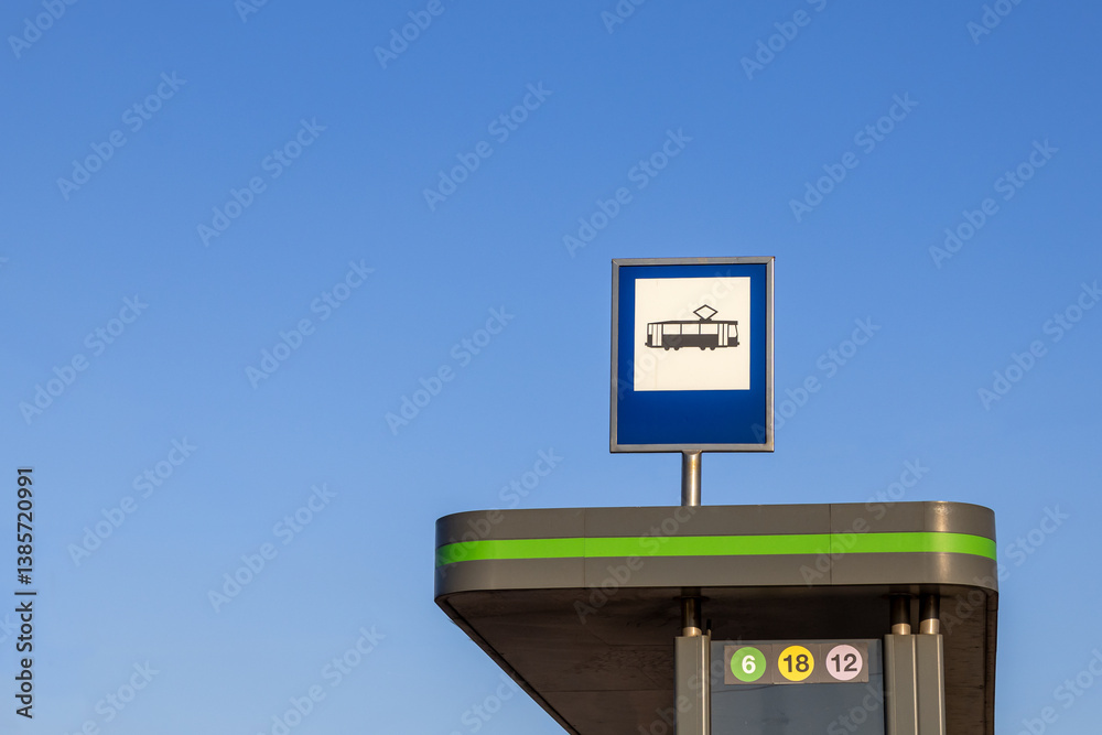 Tram stop sign on top of modern shelter against clear blue sky with line numbers visible and no people around on sunny day in urban public transportation area