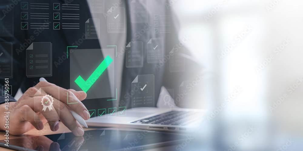 Business professional approving digital documents on touchscreen interface with green checkmarks, representing automation, paperless workflow, and task validation in modern corporate environment