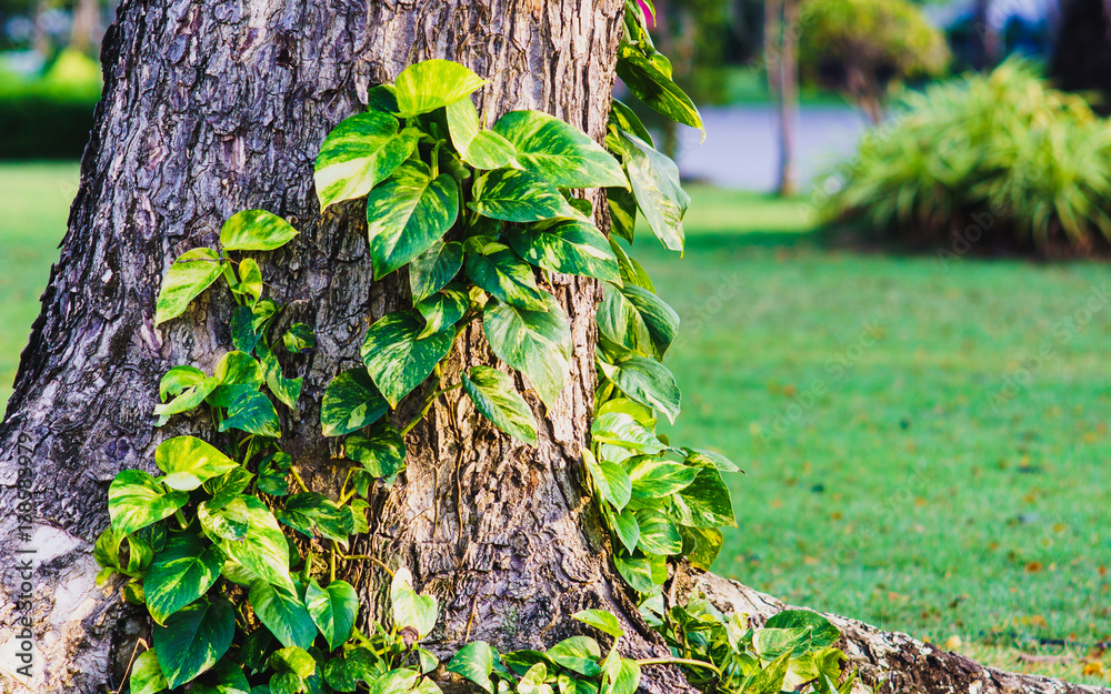 Golden pothos or devil's ivy climbing on tree in the park. Tropical garden decoration.