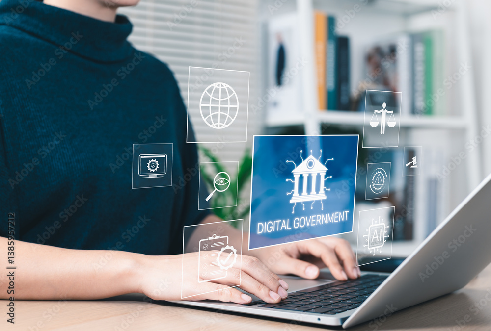 Digital government and E-governance concept. Person using laptop with icons e-governance, cybersecurity, AI, law, legal balance, government institutions, security infrastructure, online administration