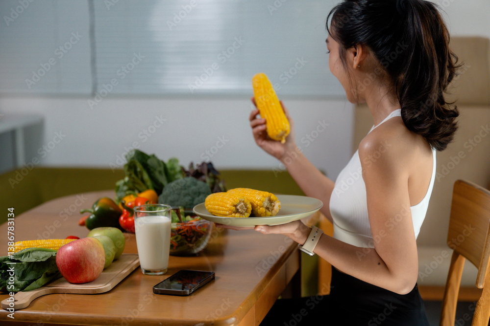 Young woman eating healthy food, holding corn on the cob at home