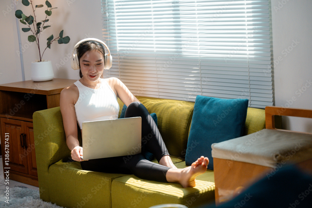 Young woman working from home sitting on sofa using laptop and wearing headphones