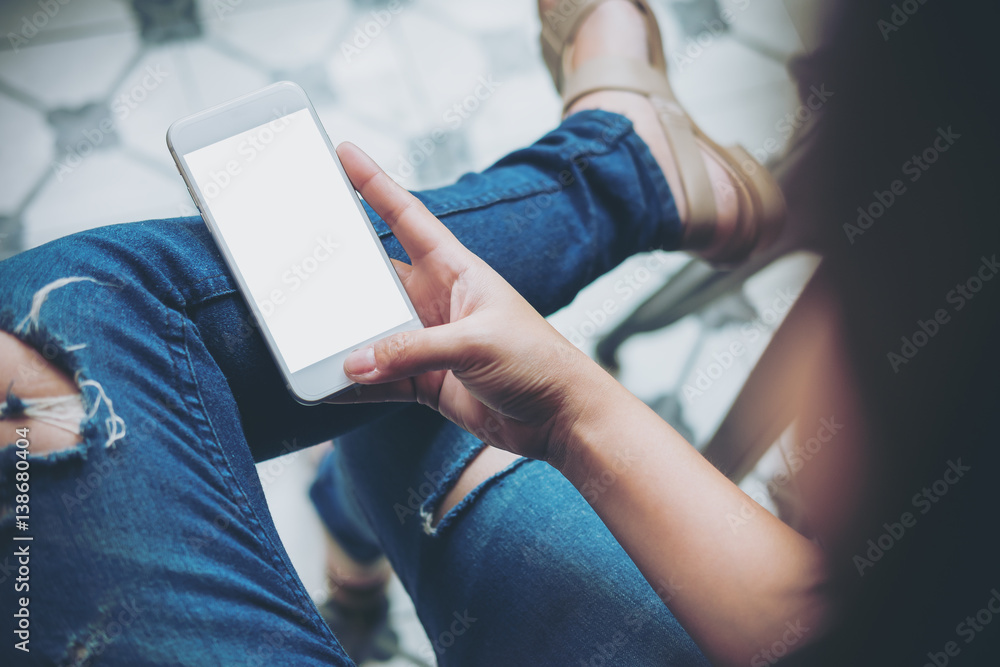 Mockup image of hand holding white mobile phone with blank white screen on thigh with a vintage tile floor in cafe , feeling relaxed