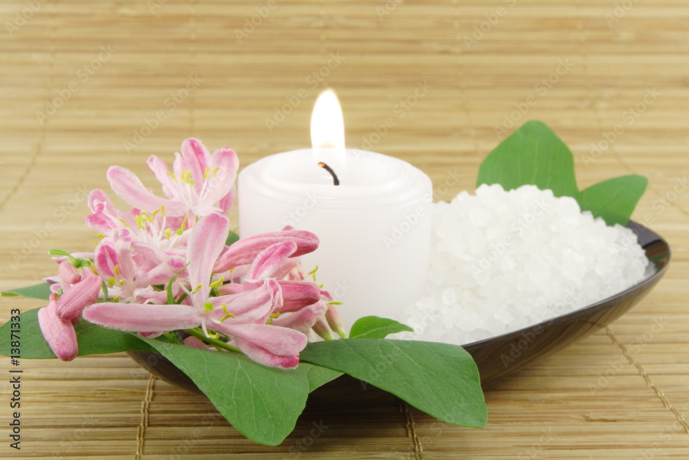 Pink flowers, candle and bath salt