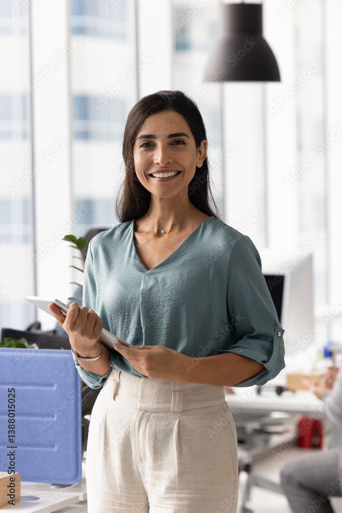 Positive confident Latin businesswoman posing in workspace, holding tablet computer, looking at camera, smiling, standing in office with workplace behind, smiling. Female business leader portrait