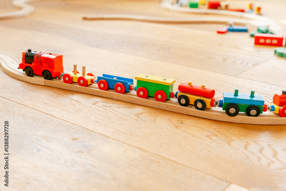 Brightly colored wooden toy train moves along a curved track on a wooden floor. Various vibrant train cars connected together create a playful and educational setup for children.