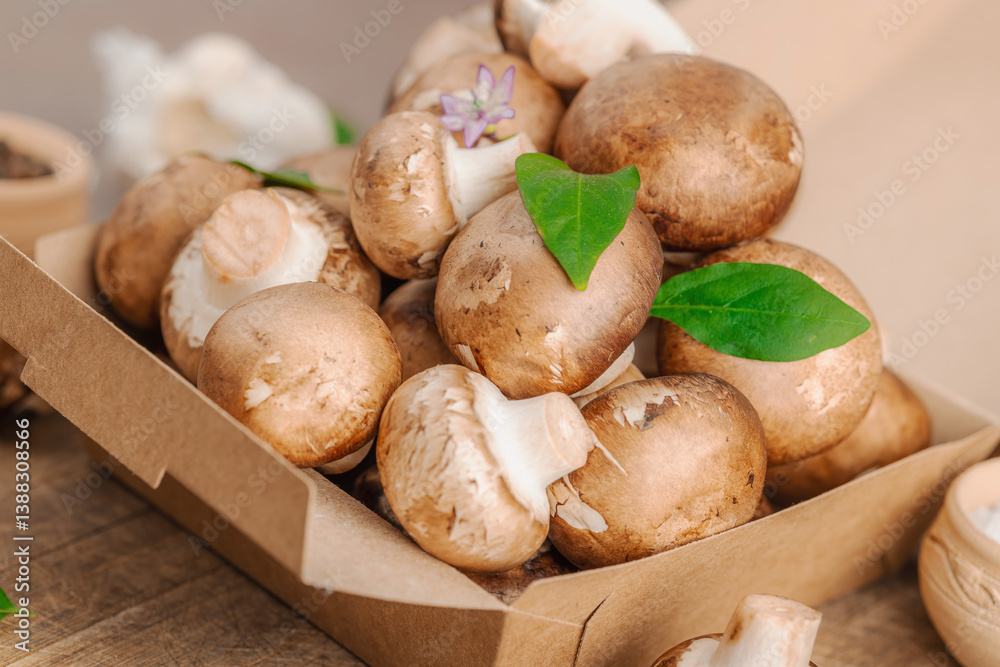 Fresh raw cremini mushrooms with spices and herbs. Healthy ingredient for cooking vegan food