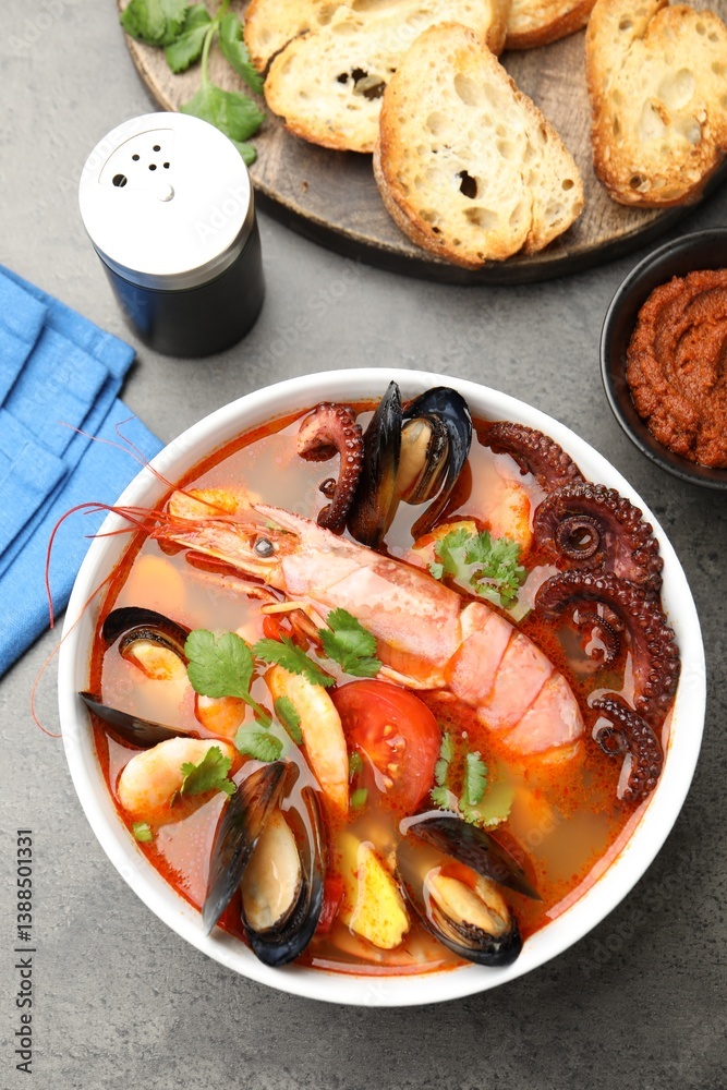 Delicious seafood soup in bowl, pieces of bread, sauce and spices on gray textured table, flat lay