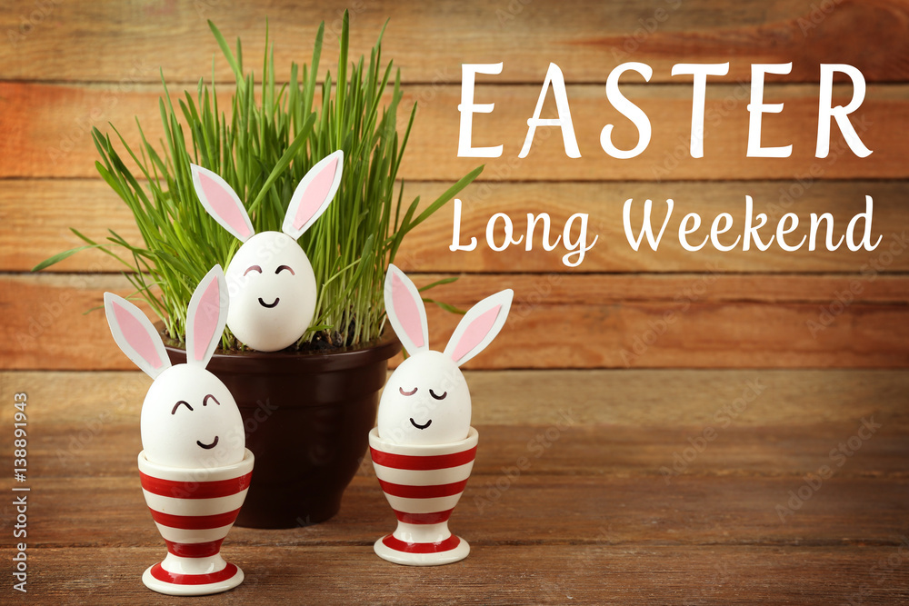 Decorated Easter eggs and pot on wooden background