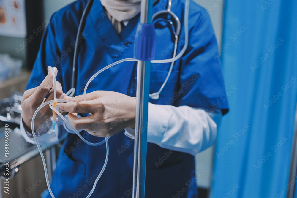 A nurse with IV drip and patient in bed in hospital room.