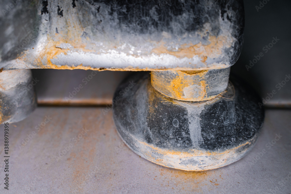 Bathroom faucet covered in scale and corrosion close-up, bottom view. Hard water and mineral deposits on plumbing