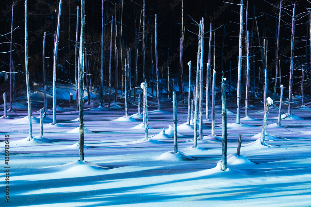 Blue pond illumination light up in winter night at Biei, Hokkaido, Japan. During the winter when the pond is frozen, it is lighting up at night