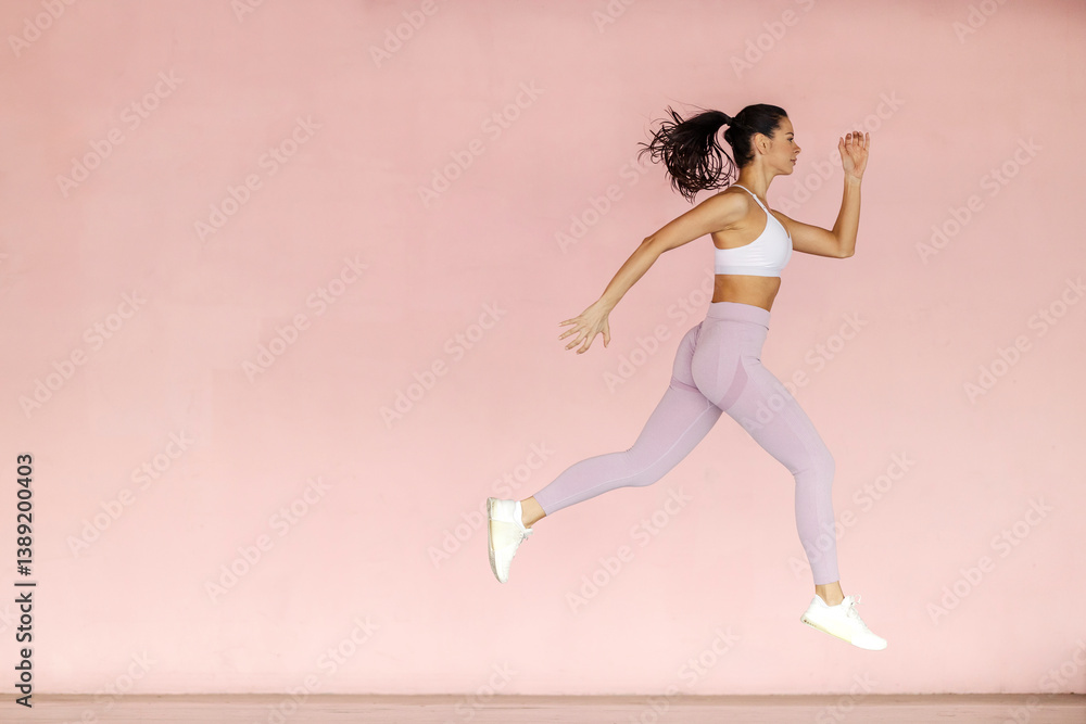 Side view of sportswoman in shape jumping and running.