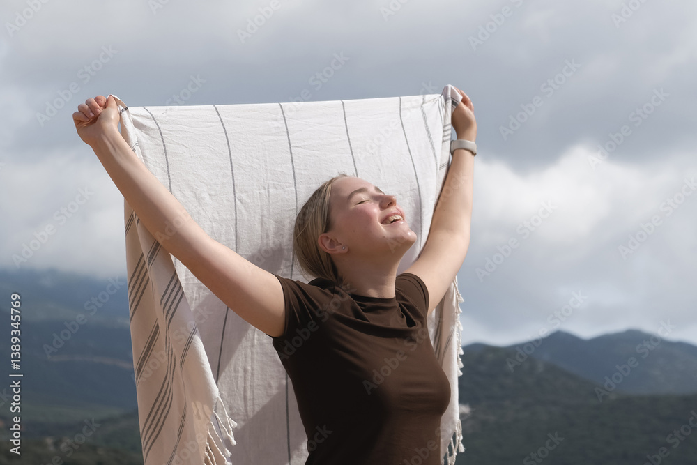 young woman embraces mountain air with closed eyes, feeling freedom and inner peace.travel, retreat,self-care, promoting mental health, relaxation, and deep connection with nature