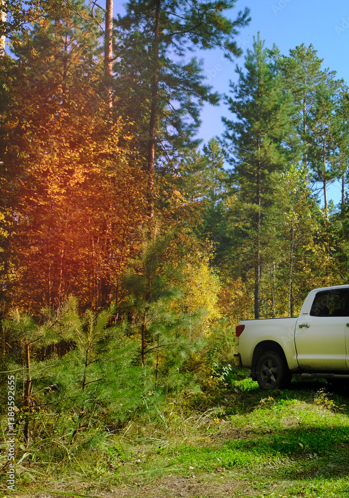 Autumn dense forest, breathtaking landscape. Car trunk of sports utility vehicle. Road Trip Concept, travel