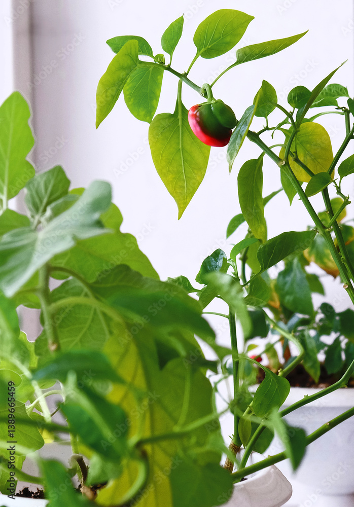 Home garden on the window sill, growing pepper bell herb in flower pot, vegetable garden, selective focus. Homegrown produce
