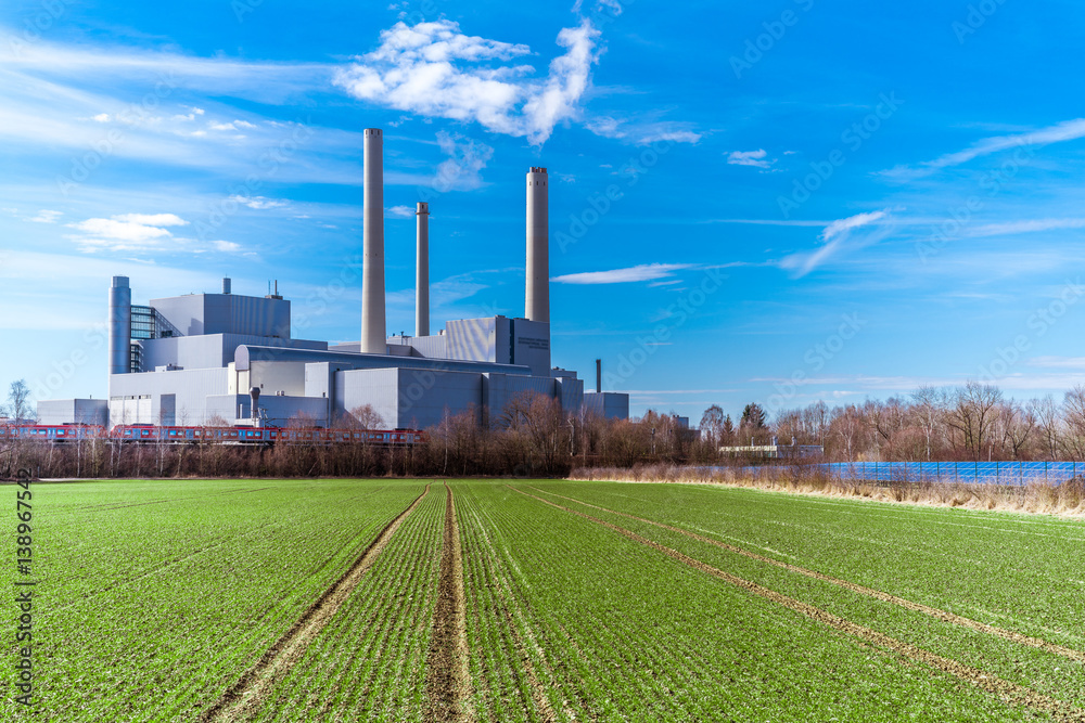 Heizkraftwerk neben einer Solaranlage und einem grünen Feld