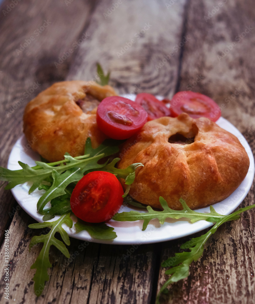 Mongolian buuz, dumplings with meat, savory fried dumplings filled with juicy meat, served on a plate with herb, arugula, tomatoes. Artisanal food