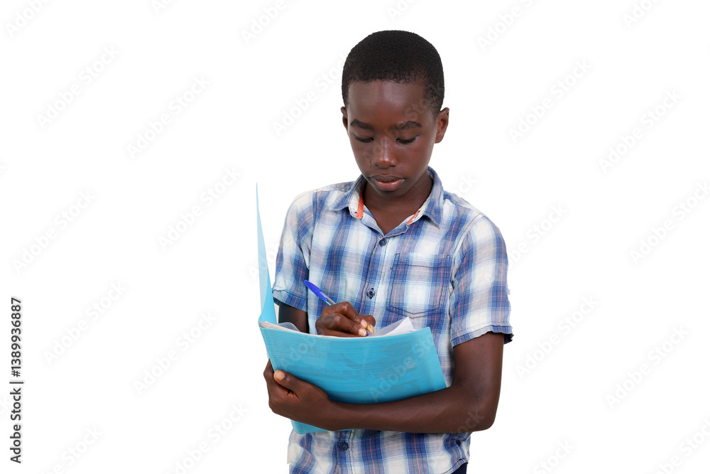close up of a young boy taking note in a notebook in his hand.