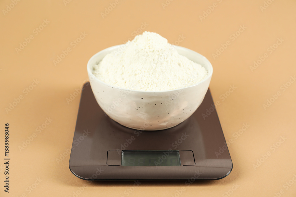 Electronic kitchen scale with bowl of flour on beige background, closeup