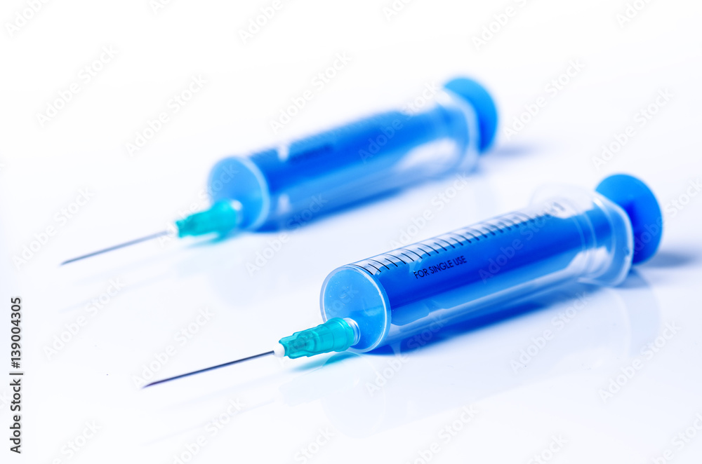 Medical equipment. Injection isolated on a white background with reflection. Pharmacy background.