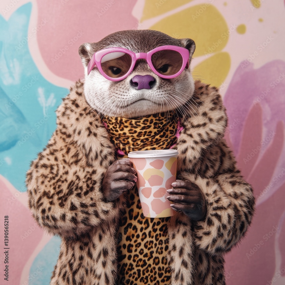 Stylish otter enjoying coffee while dressed in fashionable leopard print and sunglasses in a vibrant café setting
