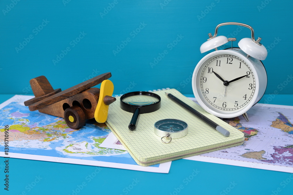 A still life about time to travel on the blue wooden background with retro alarm clock, wooden retro model of airplane, world maps, compass, magnifier, notebook and pencil. Concept of travel.