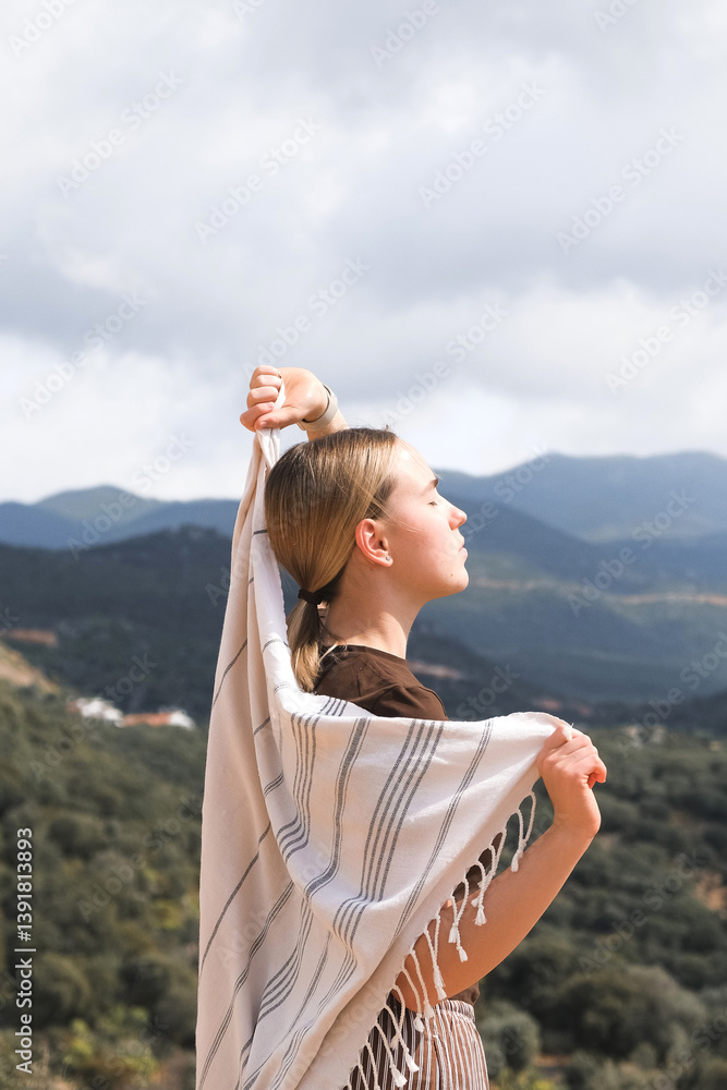young woman embraces mountain air with closed eyes, feeling freedom and inner peace.travel, retreat,self-care, promoting mental health, relaxation, and deep connection with nature