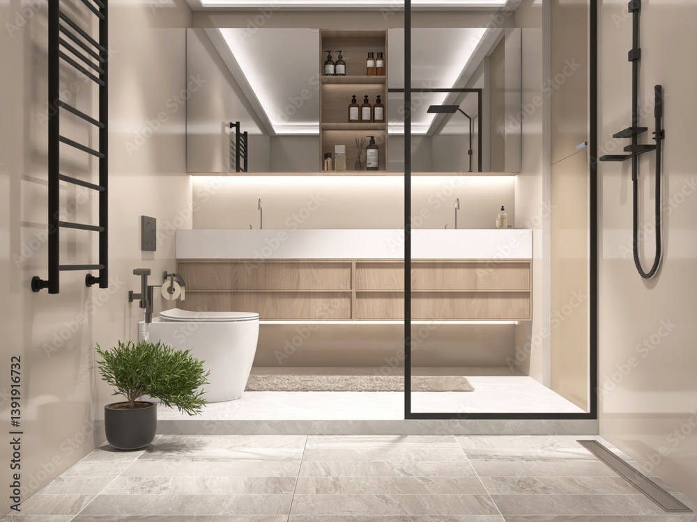 Luxury beige cream bathroom, modern toilet bowl, washbasin on cabinet counter, glass partition and shower area on white marble floor tile. Interior design decoration background 3D