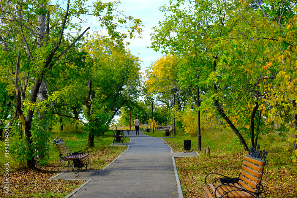 Mature woman and her spaniel dog are hiking in the city park in early fall, walking on the sidewalk. The way forward, diminishing perspective. Beautiful colorful September