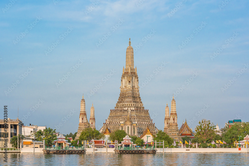 Beautiful of Buddhist temple or Wat Arun Ratchawararam Ratchawaramahawihan with famous tourist landmark sunlight in the morning, Bangkok, Thailand.