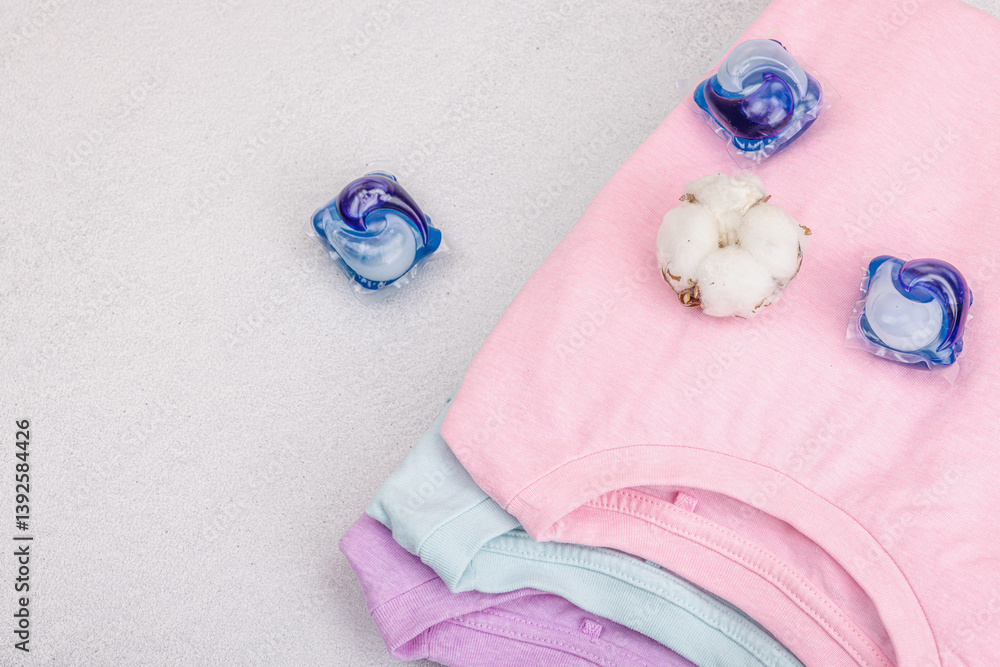 Eco friendly spring closet cleaning, capsules for machine washing. Pastel T-shirts, sale concept