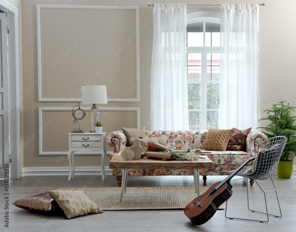 modern background and luxury home style with guitar and modern pillows, metal chiar concept