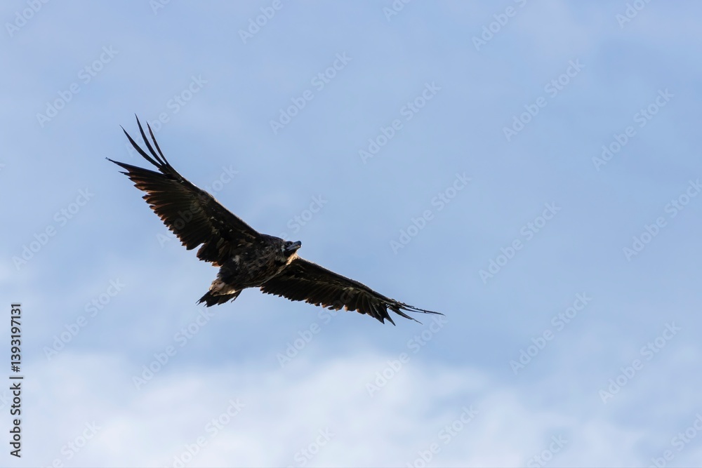 Cinereous vulture (Aegypius monachus) flying over Monfragüe, Extremadura, Spain. Blue sky with soft white clouds. Powerful bird in motion