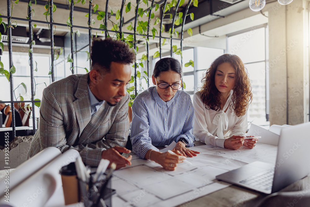 A diverse and talented team working collaboratively on innovative architectural plans within a modern workspace