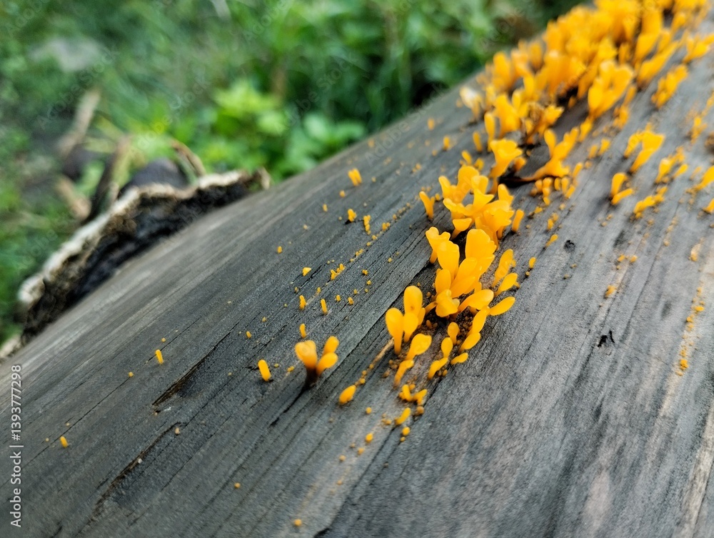 Dacryopinax spathularia or yellow fungus that grows on rotten and damp wood