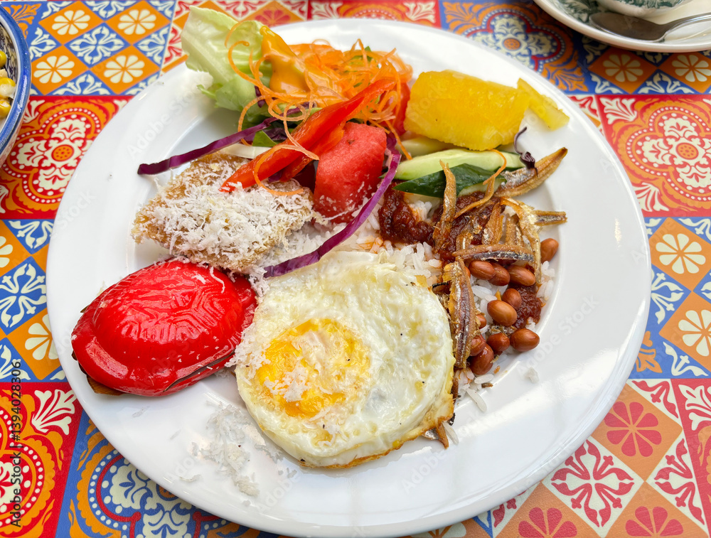 ナシレマックと目玉焼き、亀の甲羅の菓子(アンクークエ) マレーシア料理