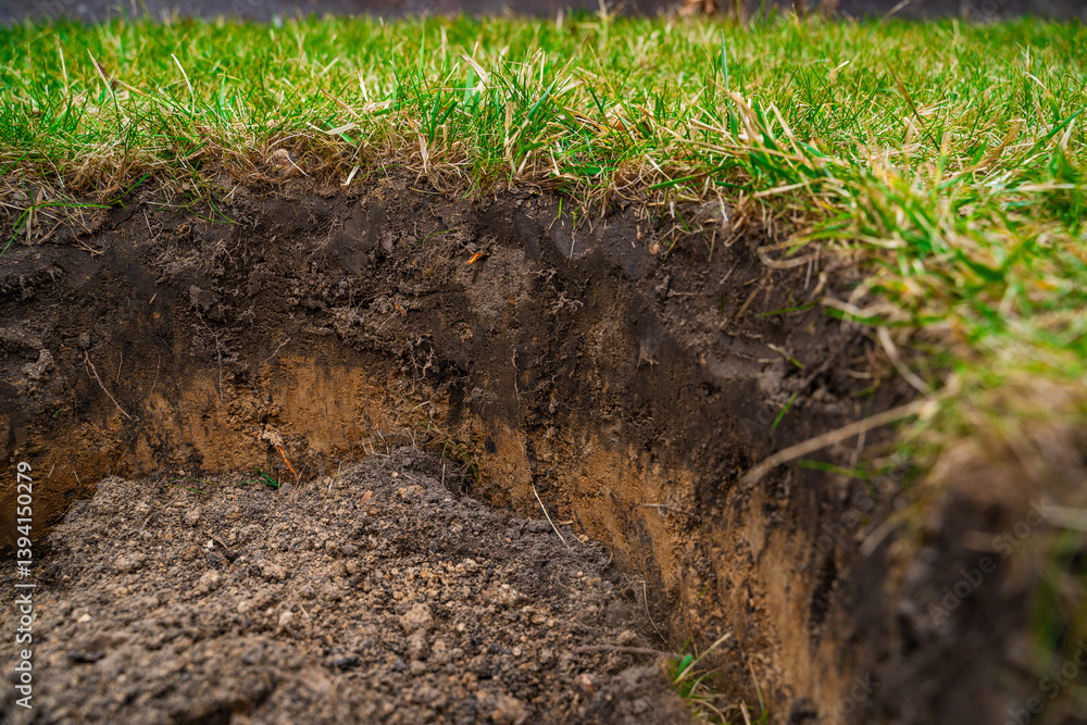 A close-up of the soil layers under the lawn. A dug hole for planting seedlings in the spring