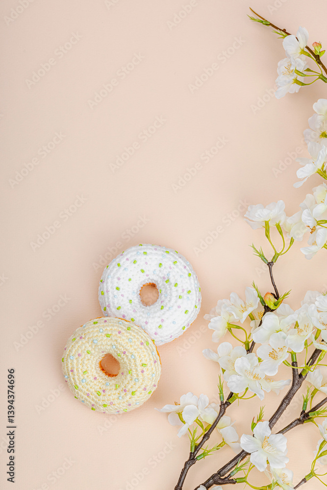 Handmade crocheted donuts with blooming cherry branches. Festive Easter, greeting card