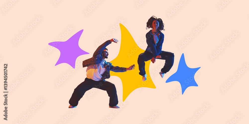 Contemporary collage artwork. Two street dancers jumping with bold expressions framed by starburst shapes in purple, yellow and blue. Concept of hobby, joy and music-infused motion.