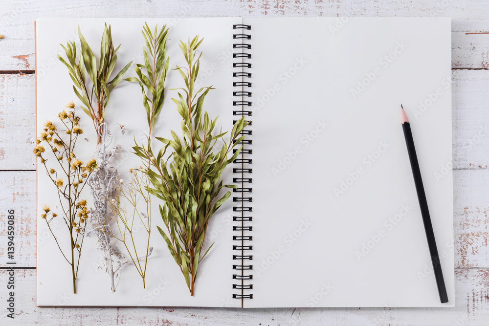 dry flower and leaf on blank page notebook on old white vintage wooden background