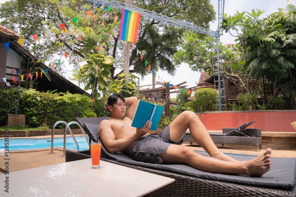 Young man is lying on a sunbed by the pool, engrossed in a book, with a colorful cocktail at his side, while a rainbow flag and festive decorations create a vibrant backdrop